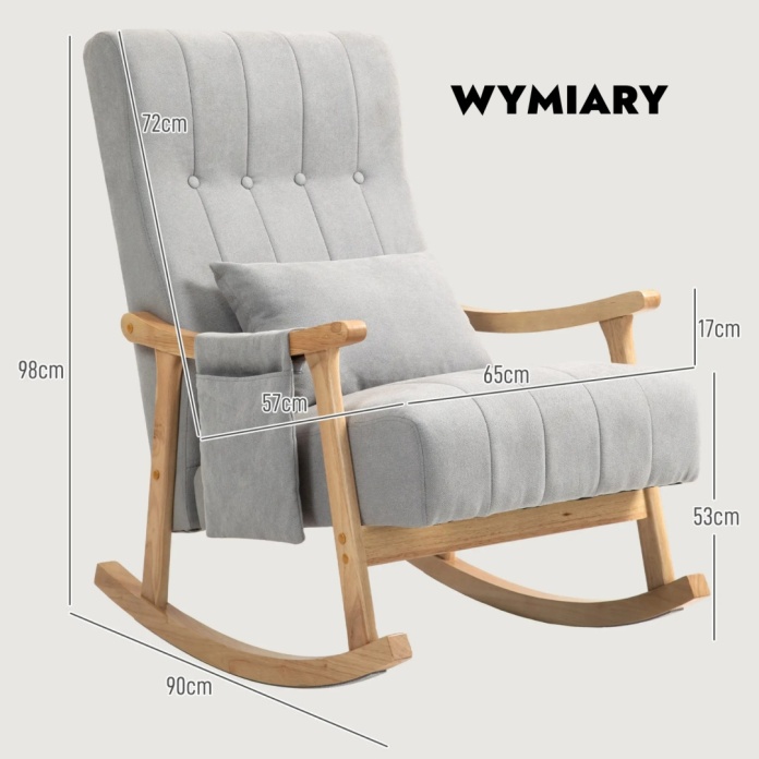 Ten stylowy fotel bujany na stabilnej ramie z drewna kauczukowego oferuje wyjątkowy komfort dzięki szerokiemu siedzisku i miękkiej tkaninie imitującej len. Wyposażony w praktyczną kieszeń boczną oraz poduszkę lędźwiową, stanowi idealny azyl do relaksu, czytania lub karmienia w absolutnej ciszy.