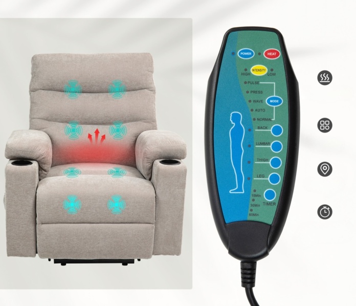 - Kojący masaż i ciepło: Osiem wibracyjnych punktów masażu (plecy, dolna część pleców, uda, nogi) w połączeniu z rozgrzewającym podparciem lędźwiowym zapewniają głęboki relaks. Wybieraj spośród pięciu trybów masażu, trzech poziomów intensywności oraz funkcji timera (15, 30, 60 minut).