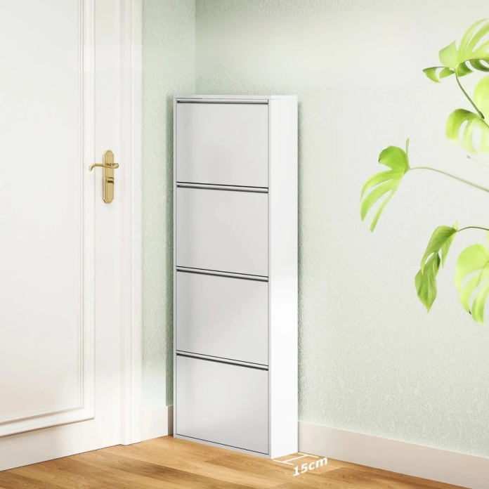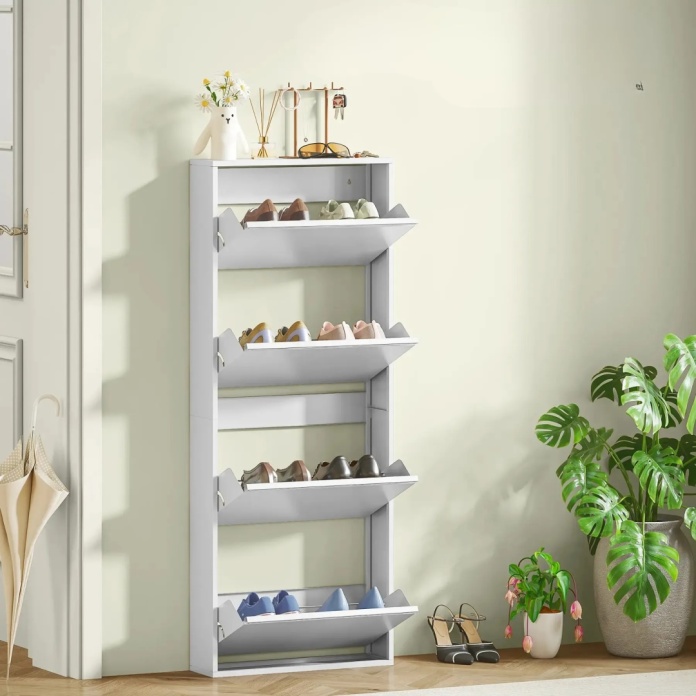 Szafka na buty z czterema uchylnymi szufladami pomieści do 8 par obuwia. Dodatkowa powierzchnia na górze idealnie sprawdzi się na klucze, dekoracje czy drobiazgi, pozwalając utrzymać porządek w przedpokoju lub korytarzu.